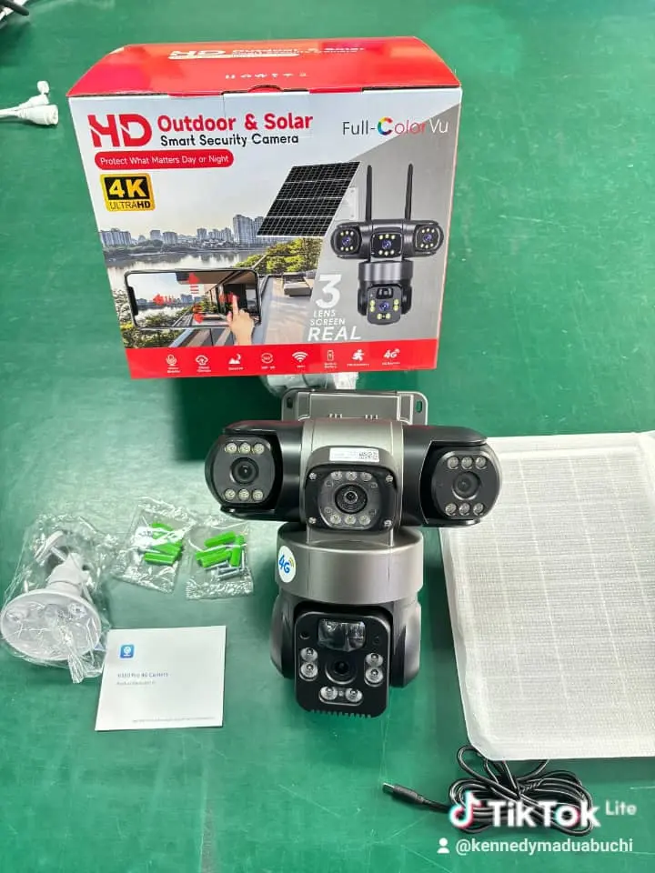 The Solar Triple Lens Camera is a smart outdoor security camera designed to protect homes and businesses day and night. It runs on solar power, so it stays active even during power outages. With three lenses, it covers a wider area and captures clear, detailed video in 4K quality.